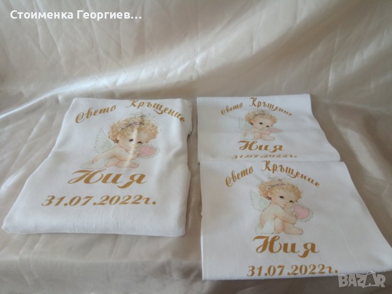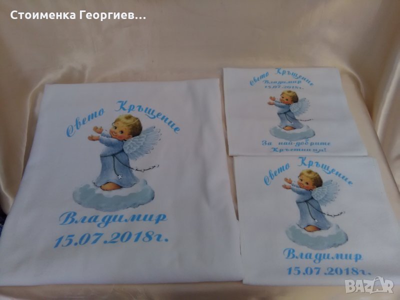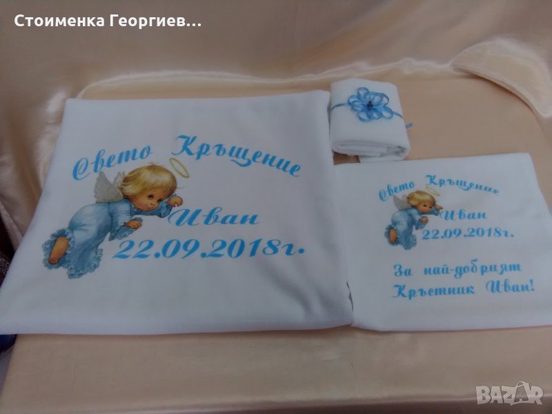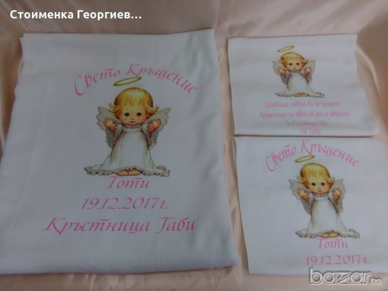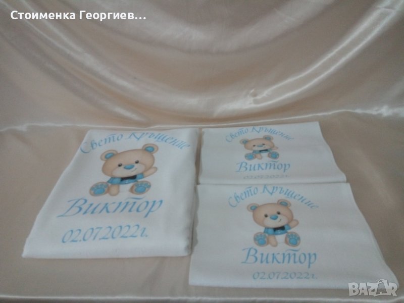 Комплект хавлии за кръщене с персонализиран печат, голям избор от мотиви и цветове, комплектът съдържа голяма хавлия с размер 70/140см+две малки размер 30/50см цената за 3 броя 45лв