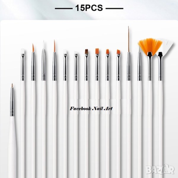 Професионални дървени четки за работа с естествени и изкуствени нокти. Четка за декорация, четка за фини детайли, плоска четка, тънка четка,точкатор, четка за акрил и други. Цвят: бял.