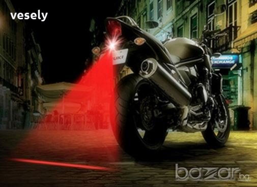 Лазерната опашка или допълнителен стоп за кола или мотор отдалеч предупреждава задно движещите се МПС за необходимата дистанция. Особено необходима при шофиране в дъжд, мъгла,запрашеност, лоша видимост, нощно време. Удобна е за водача и при задно паркиране, защото червена лента е ясно видима в страничните или централното огледало. Устройството е миниатюрно- диаметър 18mm и тегло 100 g. Водонепроницаемия лазер е червен с дължина на вълната 635 nm, мощност 300 mW и ъгъл на лъча 15 градуса. Захранване 12-24V / 100 mA- директно от автомобила. Монтира се много лесно с двойно залепваща лента, налична в комплекта или с винчета, също налични в комплекта на удобно място- например номера на колата. Тялото на лазерната пушка може да се върти на 180 градуса, съответно регулирате на колко метра зад колата да се появи лъча и застопорявате положението. Вие решаватекъде да включите захранването на лазера – дали от стоп-фаровете или директно през ваш бутон.