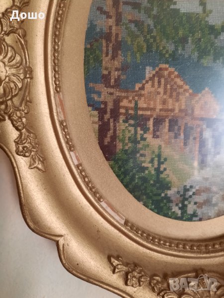 Гоблен Воденицата, ушит с конци DMC, размер 21/ 15 см, с рамката 32.5/ 27 см. Има дребни забележки по рамката, която е 50+ годишна, видни на снимките.