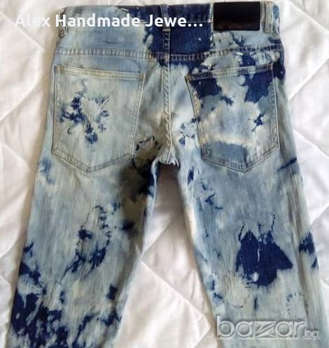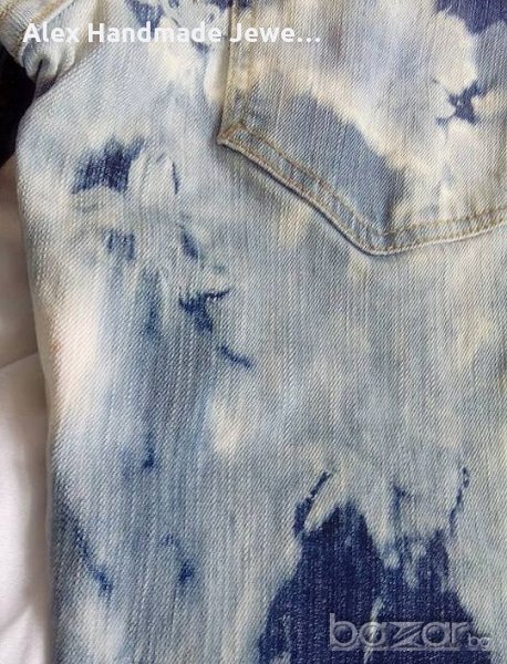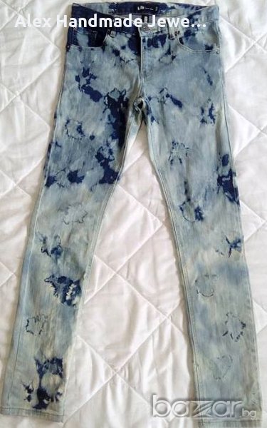 Избелени дънки Lab industries - еластични. 99% памук, 1% еластан. По етикет - размер 164 см., отговарят на 27 - 28-ми номер. Забележка: бледа точица от ръжда на единия крачол. Пада се отзад, близо до вътрешния шев. Показана е на последната снимка. Дължина: 95,5 см., от чатала; 75,5 см.; Талия /колан/: от 37 см. до 39 см.; Ханш: от 41 см. до 48,5 см.; Ширина на крачола при чатала: от 24,5 см. до 28 см., най-долу: 14 см. Дълбочина: 21,5/32 см.