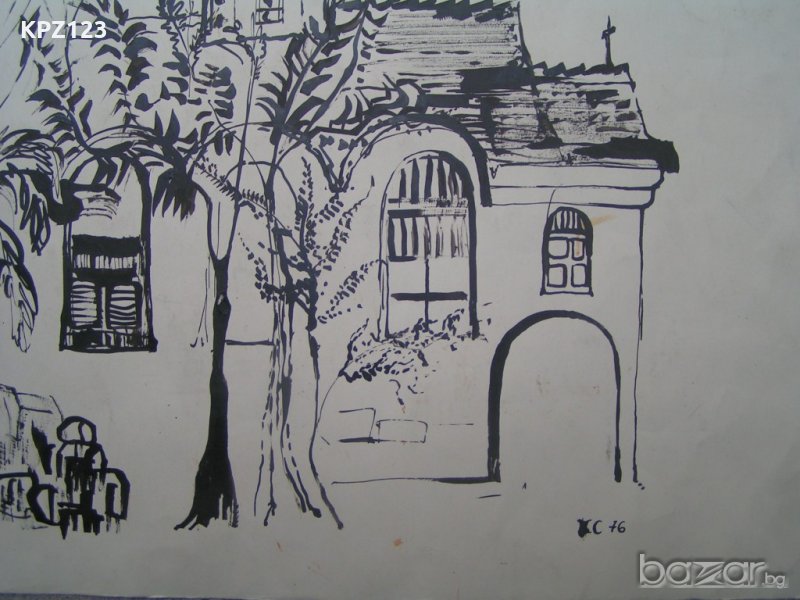 Картина на църква. Туш върху картон. Размери: 50 / 35 сантиметра. Подписана- ХС и датирана - 76 година.