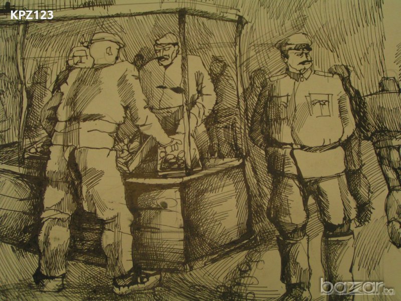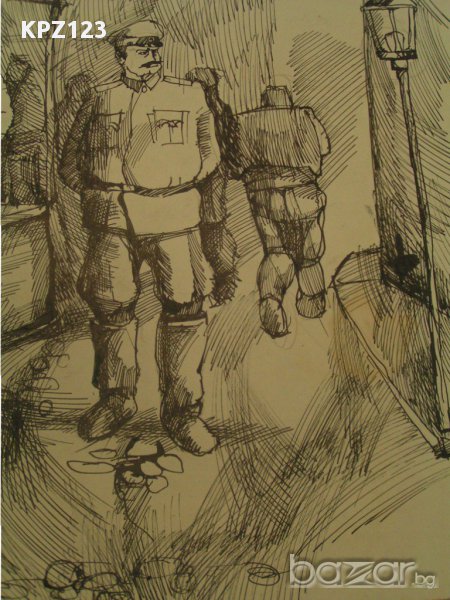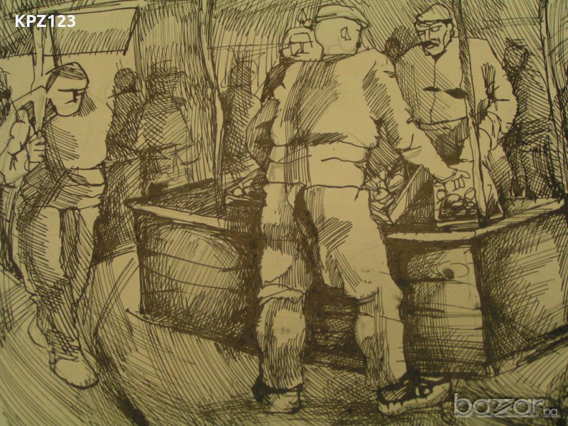 Картина "Пазар" Сергии, продавач, купувачи, фенер и кварталния стражар. Туш върху картон. Размери: 46 / 34 сантиметра.
