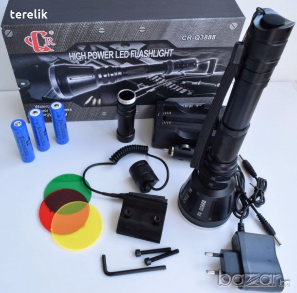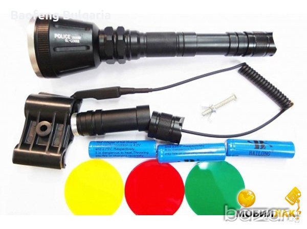 Акумулаторният фенер е със стойка за монтаж на оръжие, отделна капачка със спусък и 3бр. цветни, сменяеми пластмасови приставки - жълто, червено и зелено.