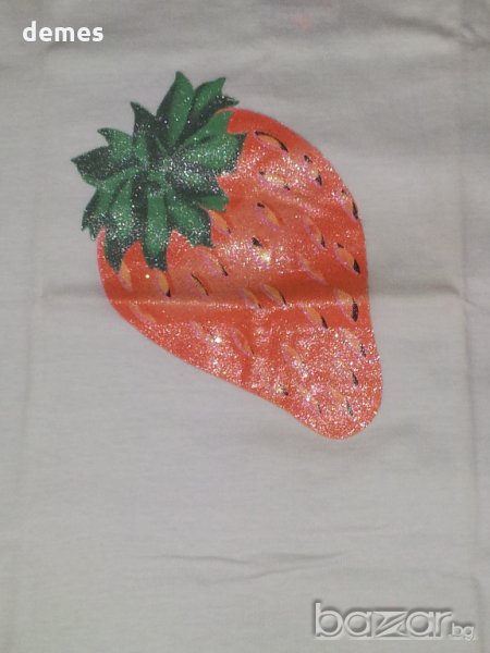 На гърдите с ефектна щампа ягода,обсипана с брокат.