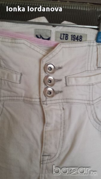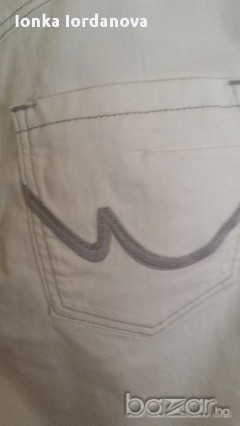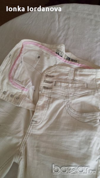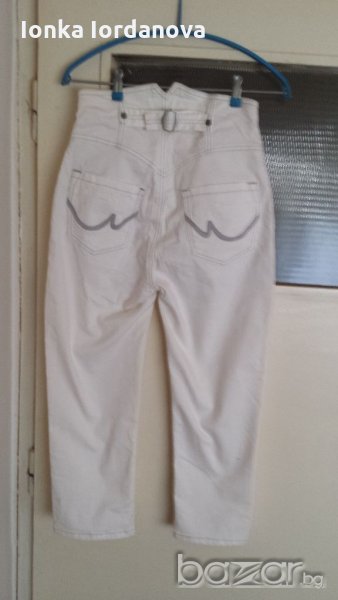 Модерни нови дънки. Цвят бял към екрю.Висока талия, страхотна кройка украсени с хубави копчета джобове, коланче с катарама отзад.Размер на талия - 70см. Дължина на крачолб- 78см.