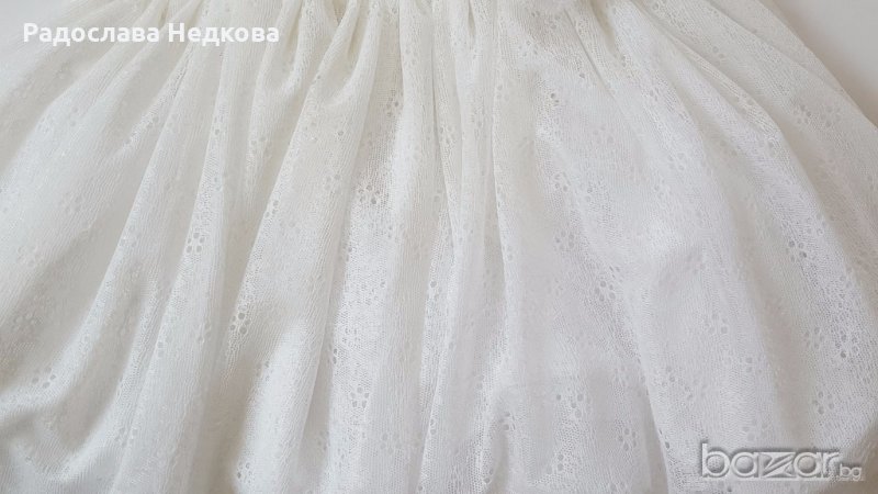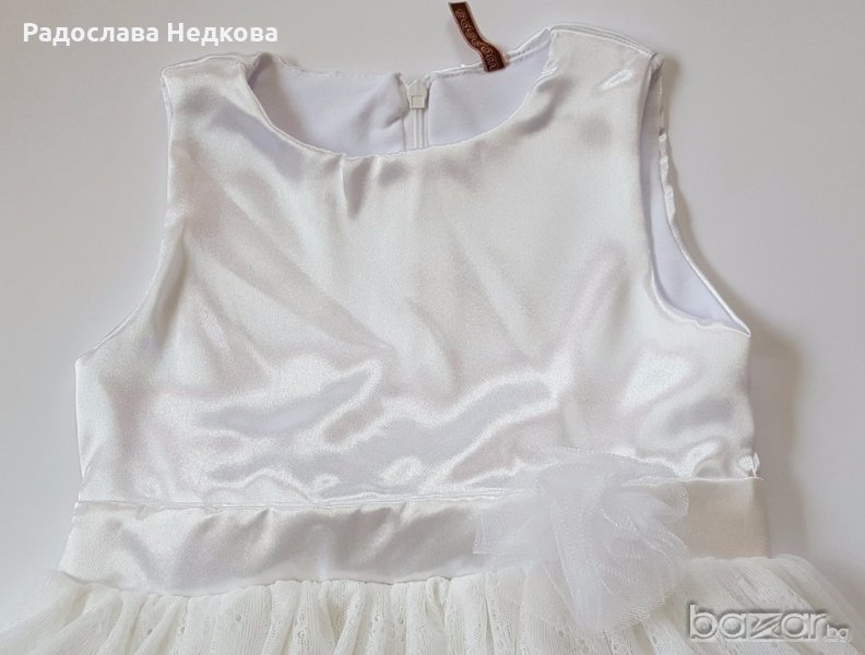 Страхотна бяла роклика - горната част е сатен, а долната е 2 пласта памучен плат с рязана бродерия и 1 пласт подплата с тюл. На кръста има декорация цвете. Закопчава се посредством цип на гърба. Налични размери - 92,98 см.