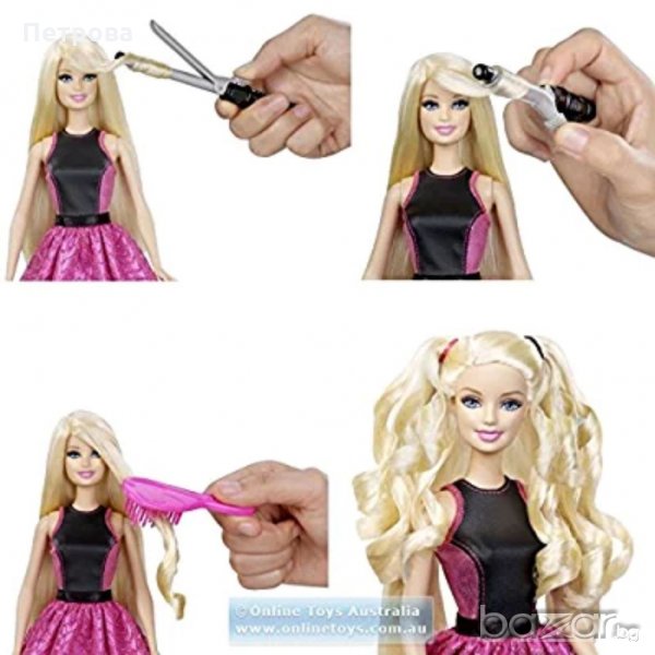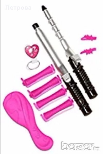 манекен (висока 30 см.); 1 бр. маша с една приставка за къдрици и една за вълни;1 бр.четка за коса и 6 бр. аксесоари за коса. Цена 25 лв.