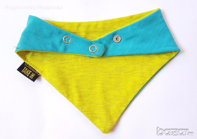 Страхотен лигавник тип бандана в син и оранжев цвят. Лигавника е с две лица, едната е в син цвят, а другата страна в зелен цвят. Много практични за периода на никнене на зъбките, а и страхотно допълнение към всеки тоалет. Закопчават се посредством тик так копчета.