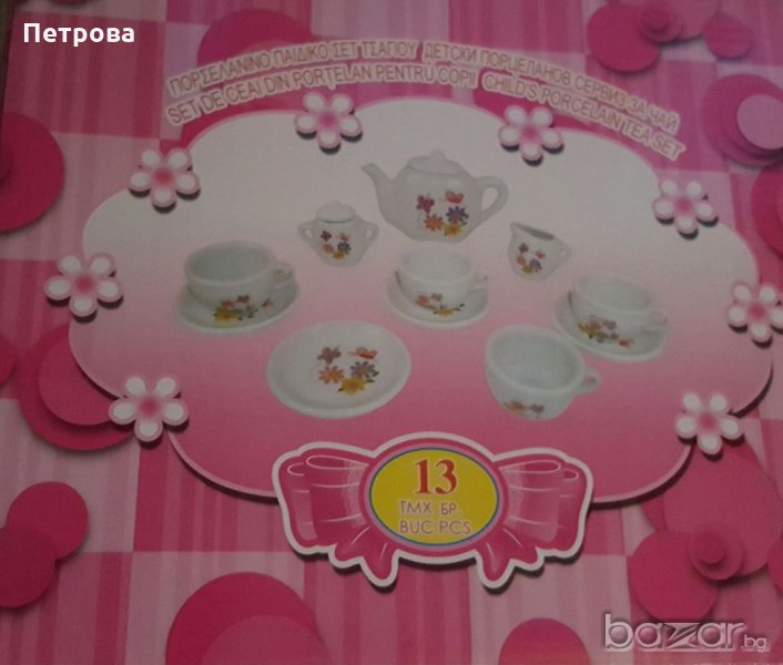 Поцеланов сервиз за кафе или чай,който може да бъде чудесен подарък за вашето дете. Сервизът е от 11 части и съдържа:1 бр. кана за кафе с капак;1 бр. захарница с капак;1 бр. каничка за мляко;4 бр. чашки;4 бр. чинийки;На кутията е изписано,че съдържа 13 части,защото капачетата на каната и захарницата се броят като отделни елементи. Опакован е в красива розова кутия. Доставка до два работни дни.
