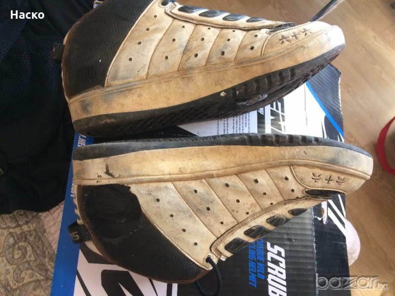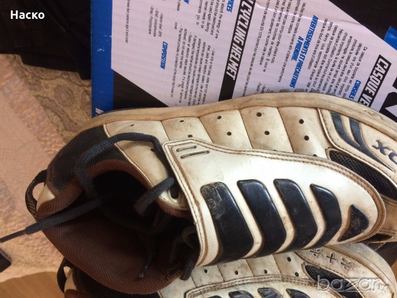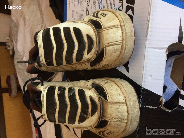 бели карани са повечко размер 27см или към 43 Имат следи от употреба, едната е протъркана от вътрешната страна но е залепена с текстилно лепило и подсилена с Дък тейп :))) държи доказано когато се изтърка дък тейпа просто го сменяте :) Също така подметката на едната е поизтъркана в горната част но ще изкара още поне един сезон. Дават се с клипсовете от снимката-30лв Имам същите но черен цвят в отлично състояние, давам ги за 60лв