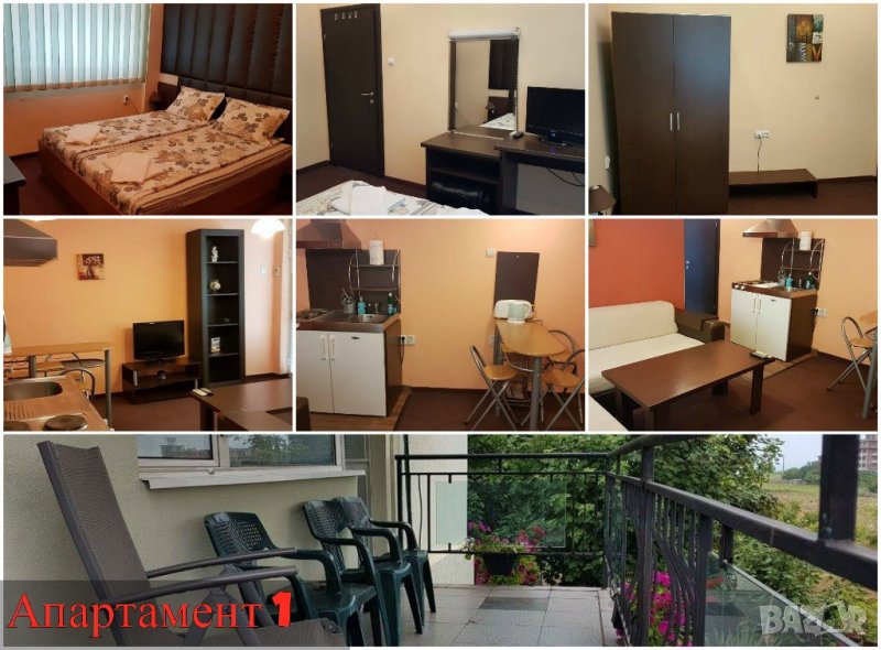 апартамент със спалня,всекидневна,баня с тоалетна,тераса.Всекидневната е с оборудвана кухня с котлони ,хладилник,тостер,мивка,посуда, ел.кана,консумативи.