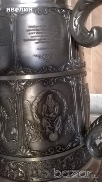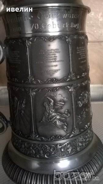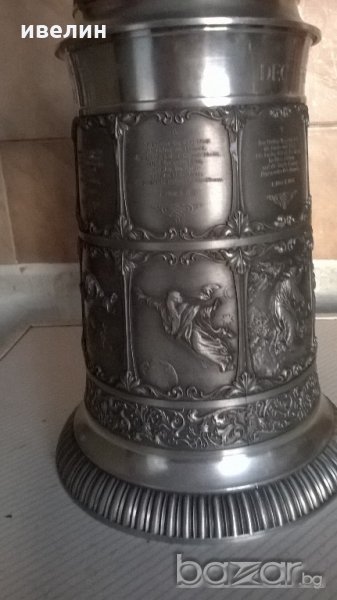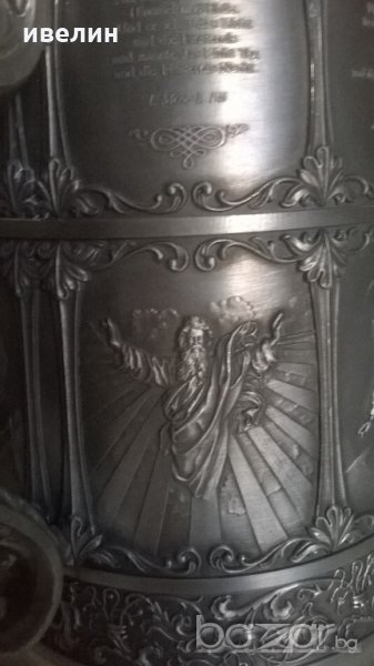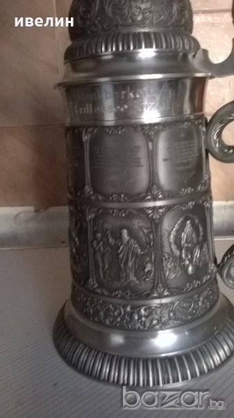 стара халба за бира от цинк.има маркировка.висока е 33см.вместимост около 1,8 литра.декорирана с изключетелно красиви библейски сцени.