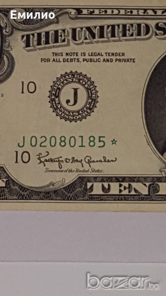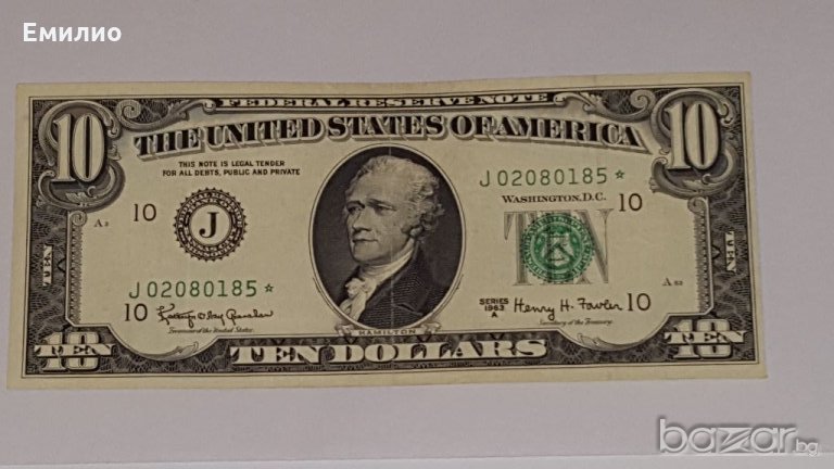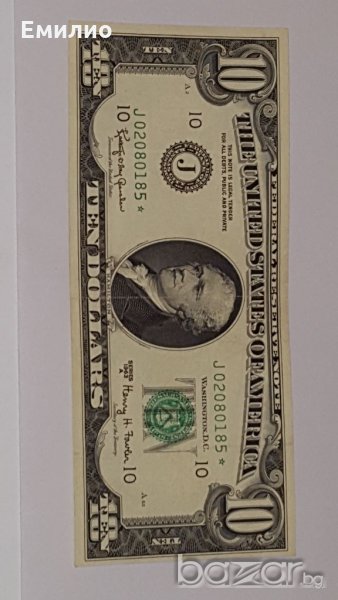 Продавам изключително рядка за Намиране Банкнота USA$ 10 DOLLARS STAR от 1963-А год Банкнота е с ЗВЕЗДА След Серийния Номер и с 7 Цифри. Състояние-Почти като Нова.