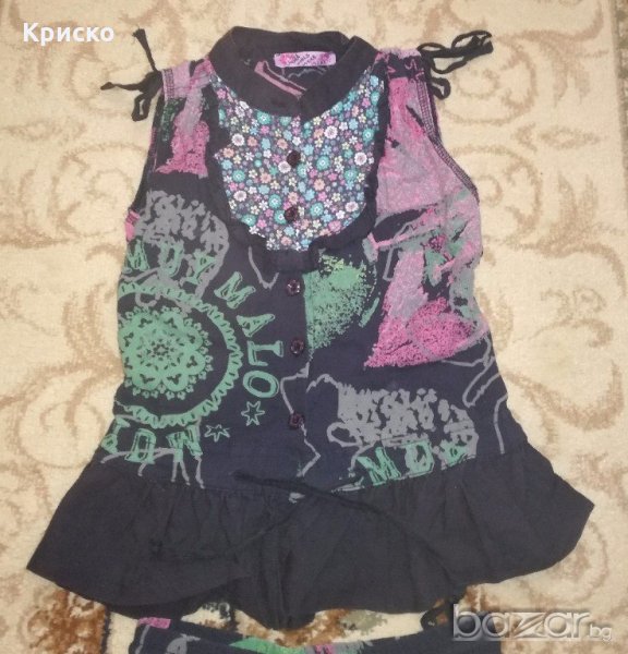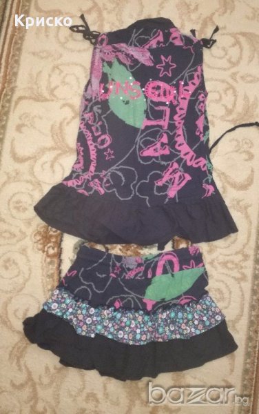но в същото време стилен и елегантен. Състои се от къса поличка и туника. Купуван е от Италия. Много е нежен и тъничък- идеален за летните жеги. Състав: 100% памук. Носен е от дъщеря ми на 4 -5 годинки, в отлично състояние, без никакви следи от употреба, с изключение на едно липсващо копче (най- горното). По етикет туниката е за 110 см, а полата е за 104 см (продаваха се по отделно и тези размери най- добре ни паснаха). Точни размери: туника- дължина от рамото 45см, ширина под мишниците 33-34см