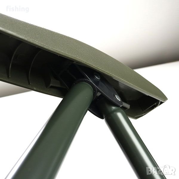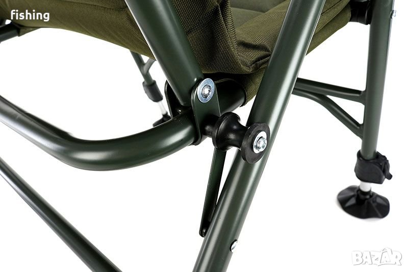Изключително удобен сгъваем стол с плътна тапицирана седалка, облегалка и табла и масивна и лека метална конструкция, изработена от алуминий и стомана. Разполага с всичките четири регулируеми крака с широки крака срещу попадане в мека земя и регулируем ъгъл на облегалката (облегалката може да се регулира, без да се изправя от стола).