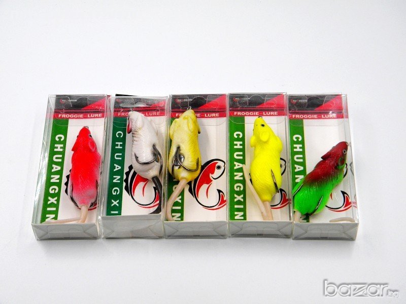 Комплекти от 4 бр., различна големина с кутийка - 15-18 лв. Зелено жабче без кука - 6 см., 5 гр., 3 лв.