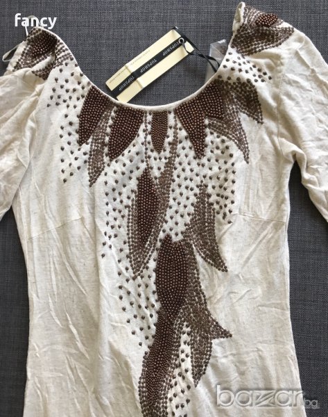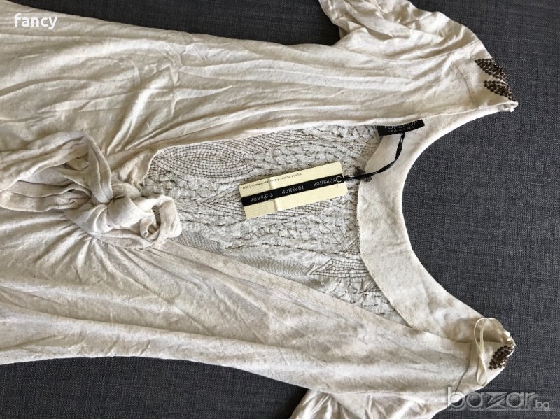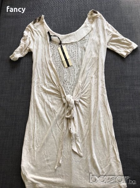 Дамска туника с гол гръб и ефектна ръчно бродирана с капси и пайети предница. Може да се ползва и като плажна рокля. Закупена от Topshop за 35£. Чудесна за лятото. Отзад гърбът е дълбоко изрязан. Има и връзки отзад.