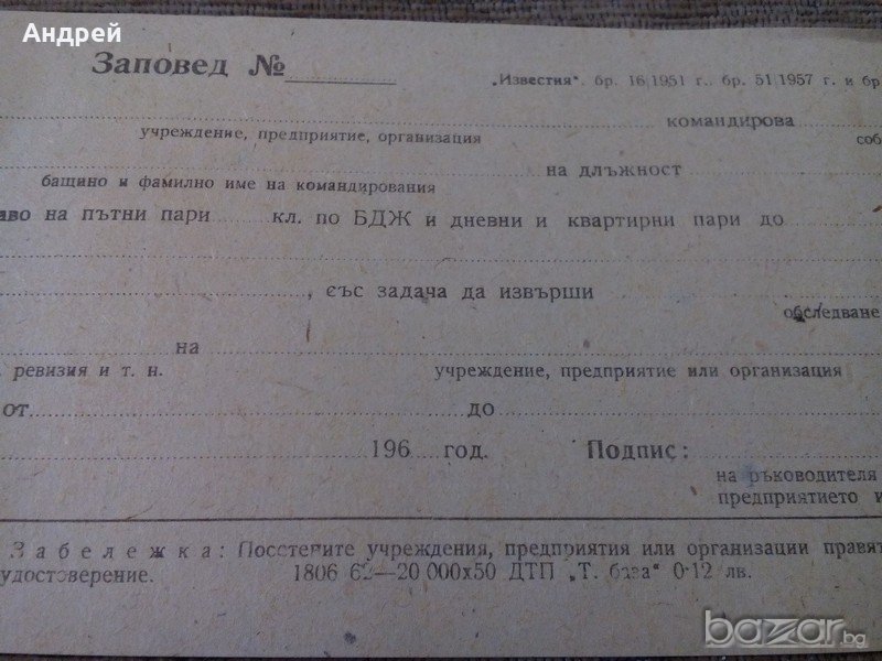 Командировъчна заповед, снимка 1 - Антикварни и старинни предмети - 18665142 Командировъчна заповед, снимка 2 - Антикварни и старинни предмети - 18665142 Командировъчна заповед, снимка 3 - Антикварни и старинни предмети - 18665142 1/3