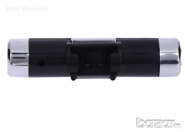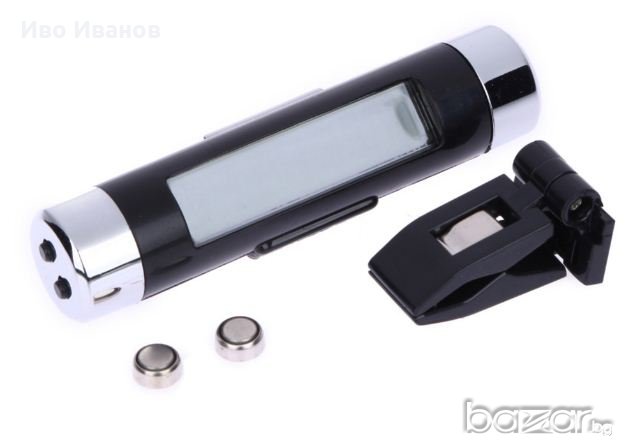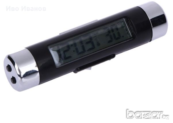 Нов дигитален LCD часовник за автомобил със синя подсветка и термометър за температурата в купето.Този часовник издържа както на ниските така и високите температури в купето и работи изключително точно. Прецизно отчита температурата. Работи с 2 броя батбатерии модел AG3 (включени в комплекта). Бърз и универсален монтаж - щипка, възможност за регуллиране. Размери:83 x 19 x 19 mm.Тегло – 40гр.Цвят черен.