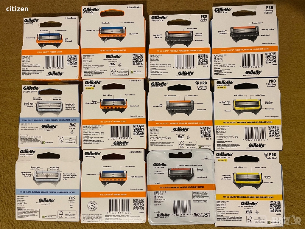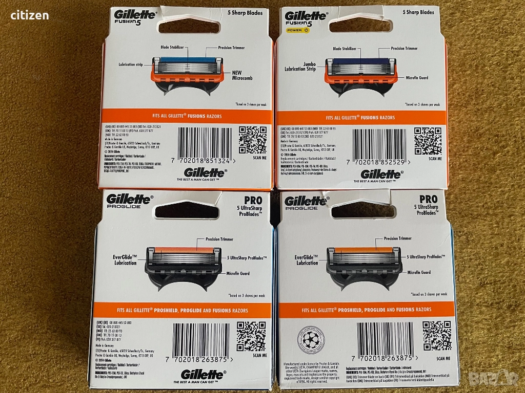 Жилет ножчета с 5 остриета купувам от Англия от 2015г.,ebay.co.uk е английски електронен пазар на който в момента има 2900 сделки на "Gillette Fusion...",това са предимно сделки за един пакет 4-ка или 8-ца и цената е съответно около 10 и 16 англ.лири, може и повече. Продавачите са юридически и физически лица базирани в Англия, продават Жилет ножчета от доста години назад, извършените вече от тях сделки са с рейтинг (+) оценени вкл. и за Жилет. Продавачите от които аз купувам продават и друга козметика и стоки освен Жилет Фюжан. Ebay е глобална платформа за търговия,в която всяка сделка е гарантирана и със срок на оспорване от 180 дена при нередност. За всяка продажба се дължи 15% такса от продавача. Плаща се ефективно на месечна база. Дизайна на опаковката на ножчетата от моите снимки е предназначена само за територията на Англия , на гърба има само английски надписи, не се интересувам от Жилет който изглежда по друг начин. Англия е голям пазар от 63 милиона население затова Жилет произвеждат дизайн на опаковка само за продажба на нейната територия.