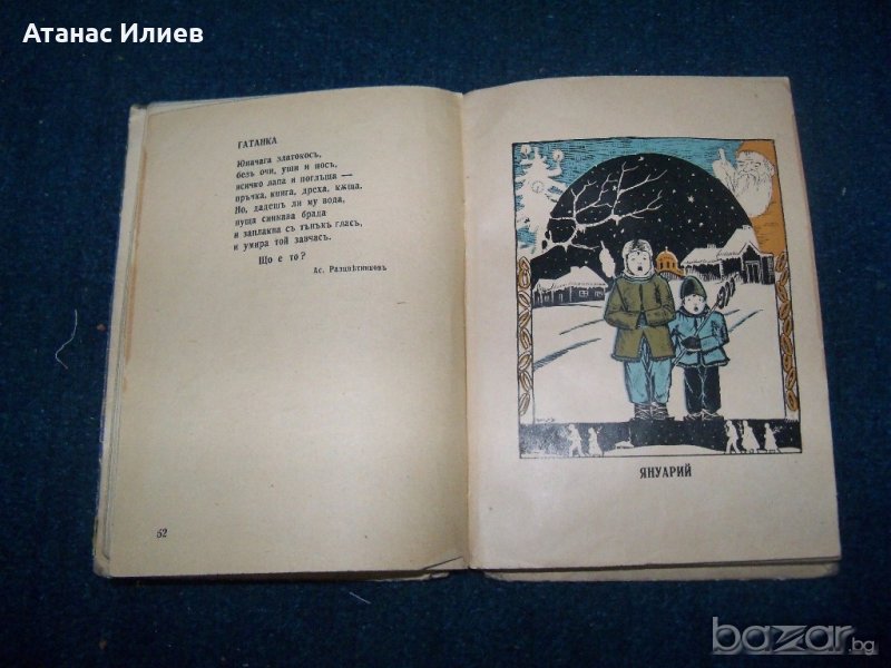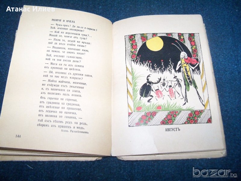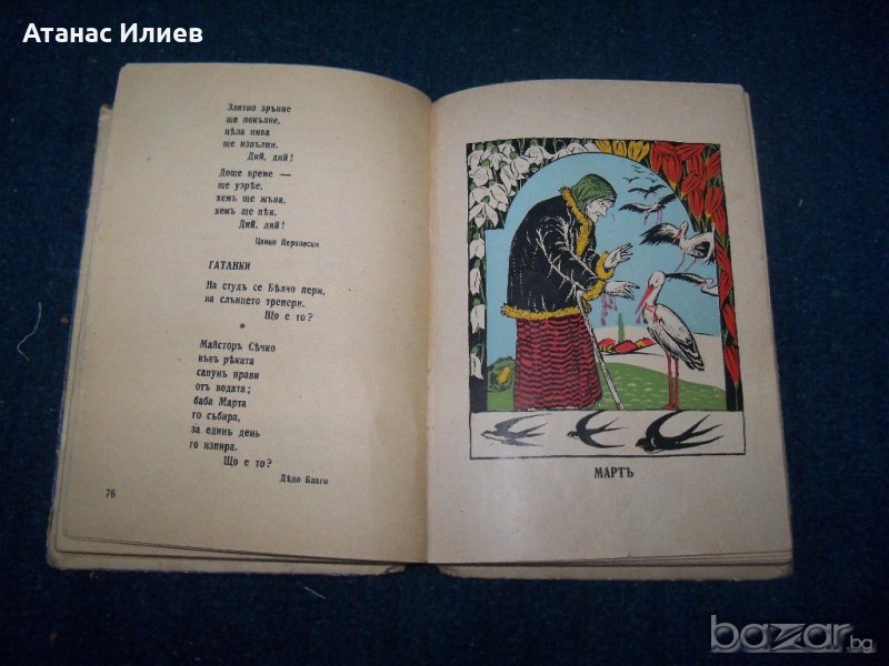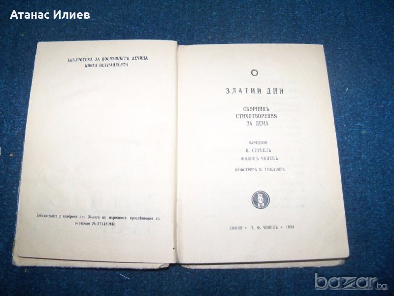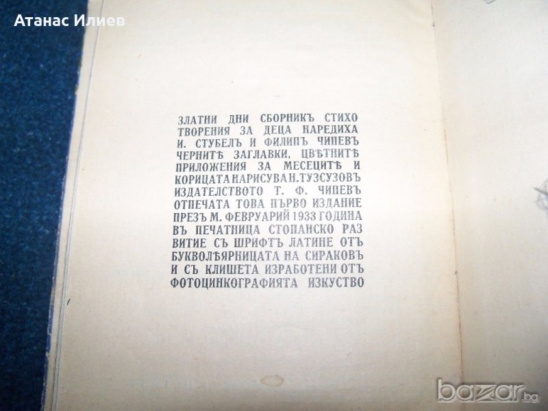 "Златни дни" сборник стихотворения за деца, наредили И. Стубел и Филип Чипев, илюстратор Н. Тузсузов. Книгата е с твърди корици, 168 стр. първо издание от 1933г. на издателство "Т.Ф. Чипев". Книгата е със страхотни 12 цветни литографии за всеки един от месеците на годината, няма липсващи страници, на някой от страниците е драскано с молив, но не и по илюстрациите, липсва гръбчето.