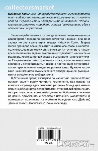 Защо потребителите са готови да заплатят по-високи цени за даден бранд? Заради по-доброто качество и външен вид, но и заради неговата репутация, твърди Найджъл Холис. Твърде много марки обаче разчитат на отминала слава, а маркетолозите насочват цялото си внимание към изпълнението на конкретните планови задачи, вместо към създаването на смислено различие, което да остави следа в съзнанието на потребителите. Съвременният пазар прелива от стоки, които не възпитават лоялност у потребителите. А именно постоянният потребителски интерес е ключът към дългосрочния успех. Нужно е насочване на вниманието към смислената диференциация: функционална, емоционална и обществена. В „Успешният бранд” експертът по маркетинг Найджъл Холис поставя акцент върху четирите компонента, въз основа на които се изгражда един смислено различен бранд: цел, изпълнение на обещанията, потребителски отклик и диференциация. Авторът подкрепя своите наблюдения и обобщения с анализи на данни, проучвания, интервюта с изтъкнати маркетолози и примери от практиката на глобални брандове като „Дайсън”, „Джони Уокър”, „Фолксваген”, „Кока-кола” и др.