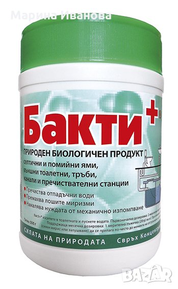 За 2 броя цената е 26 евро. БАКТИ+ е безопасна природна технология. Препаратът е произведен в Словакия и се състои от специално избрани бактерии, които след активация с вода се размножават много бързо и започват да изяждат органичните отпадъци.Характеристика: Опаковка: 500гр. Кутия Външен вид и цвят: Прах, светло бежов Съдържание на опаковката: 500гр активен прах Бакти+, 1 мерителна лъжичка- 20 гр., Инструкции за употреба (Бъл/Анг) Срок на годност: 2 години от датата на производствоНачин на употреба:За употреба в септични и помийни ями или пречиствателни станции за отпадъчни води: Първоначално- 2 мерителни лъжички ( 40гр.) на 1 м3. Поддържащо месечно дозиране- 1 мерителна лъжичка ( 20гр.) на 1м3. Нужното количество от продукта се разтваря в хладка вода- около 200мл за 1 мерителна лъжичка, като разтворът се разбърква периодично за период от около 10минути, след което се изсипва в ямата или най-близката до нея тоалетна и се пуска водата.За употреба при сухи, външни