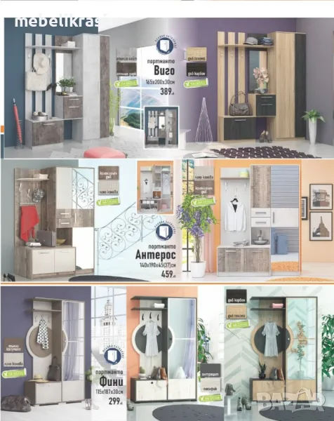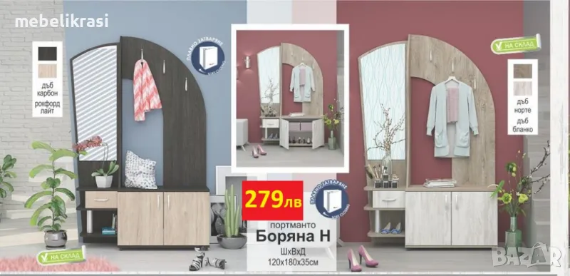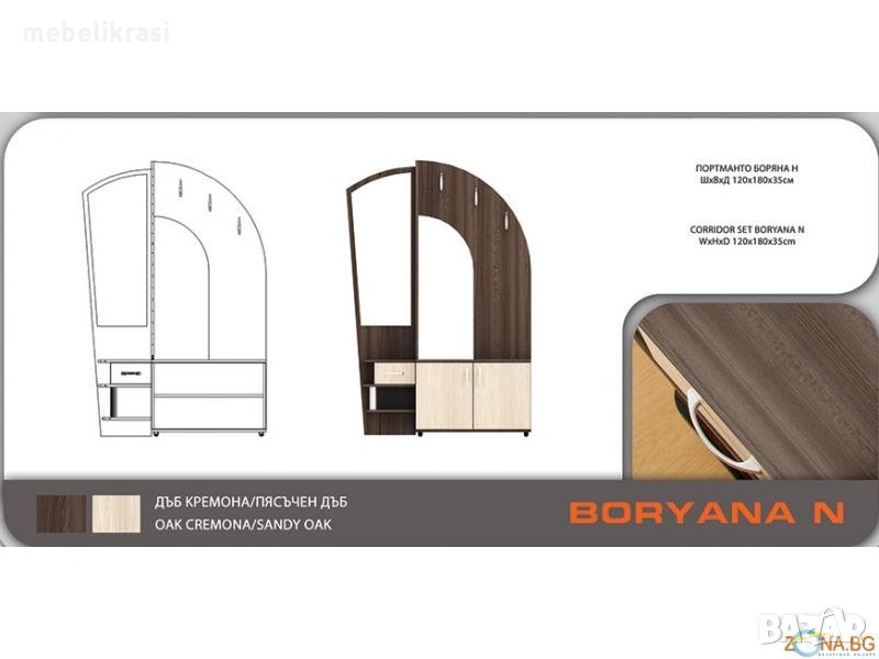 "Боряна " е компактно портманто, с овални несиметрични форми- подходящо за антре или коридор, дори и да са с ограничено пространство. Разполага с огледало, шкаф за обувки, чекмедже, долна етажерка и пано с три закачалки.