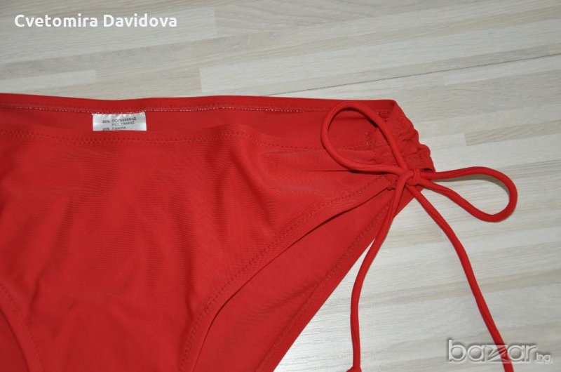 Банския е нов без етикет. Горнището е с меки чашки, долнището е бикини с декоративни връзки отстрани. Размер 44.