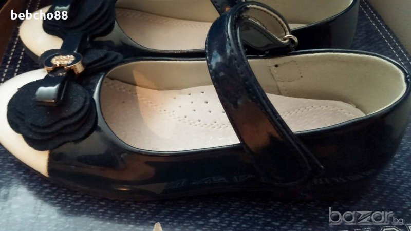 Страхотни лачени обувки с панделка в тъмно синичко и бяло,елегантни, носени на два празника и прибрани, леко наранени отпред без да личи обути:)