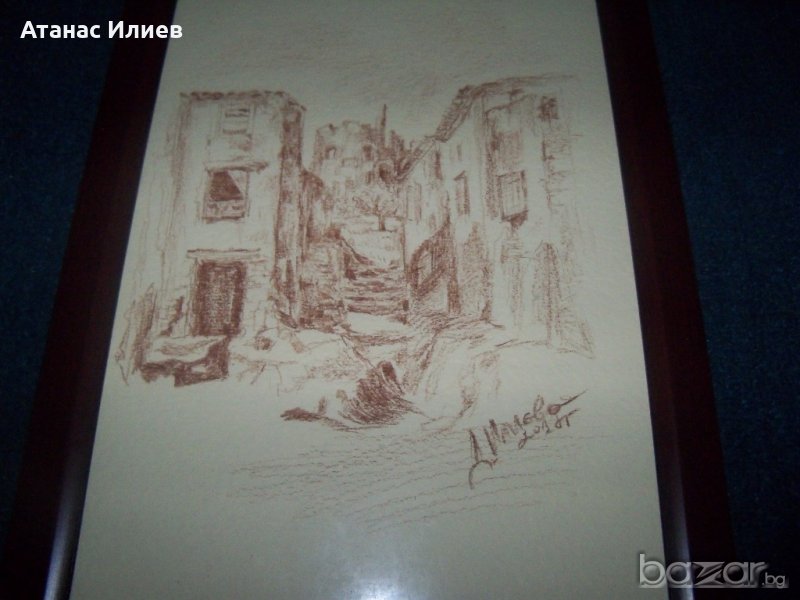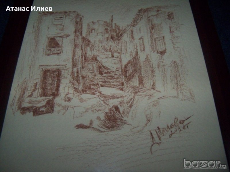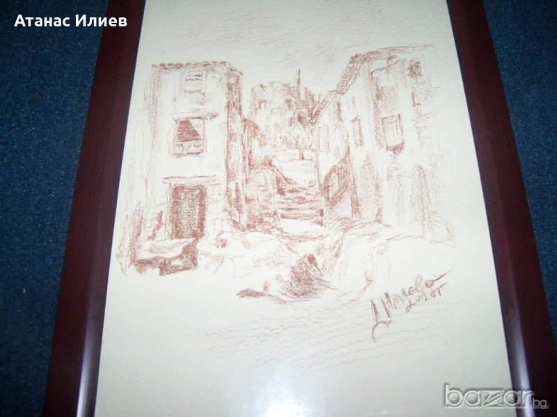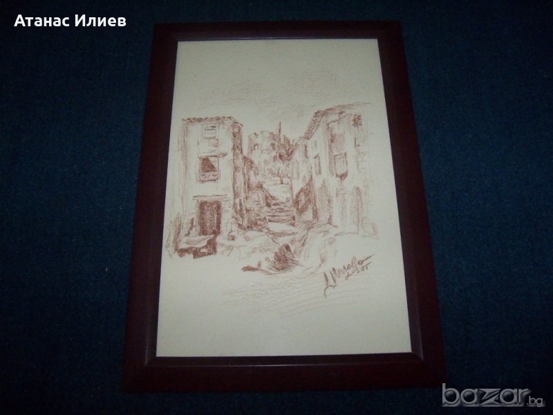 "Към старата крепост" графика от худ. Десислава Илиева, подписана. Техника сангин. Размери с рамката 34х24 см. Авторката е завършила специалност сценография, ученичка на известните видински художници Чавдар Петров и Цветан Тимотеев. Нейни картини са притежание на колекционери в страната и чужбина.