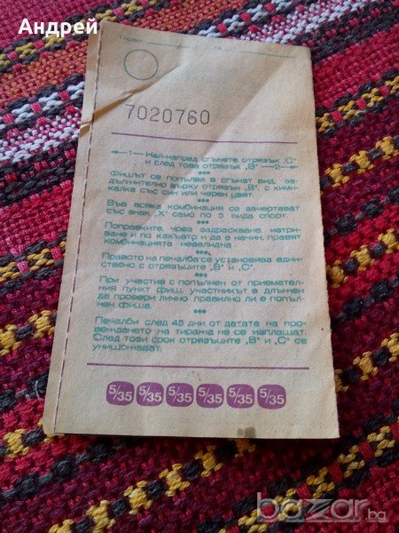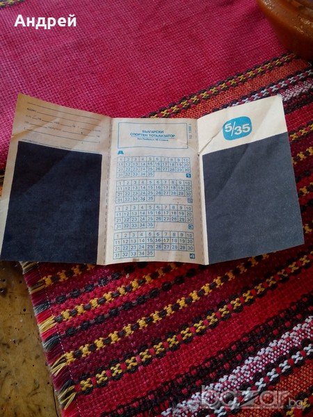 Стар тотофиш, снимка 1 - Антикварни и старинни предмети - 18767037 Стар тотофиш, снимка 2 - Антикварни и старинни предмети - 18767037 Стар тотофиш, снимка 3 - Антикварни и старинни предмети - 18767037 1/3