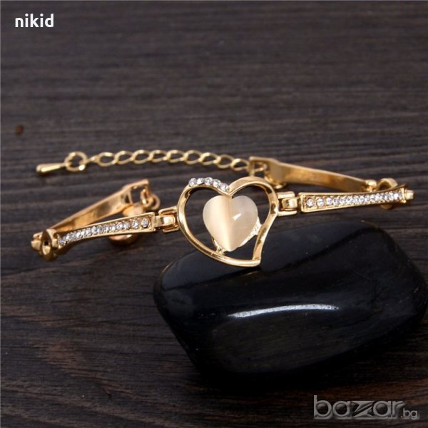 Нежна златиста дамска гривна със сърце и седефена перла и камъчета котешко око → Обява 18767625