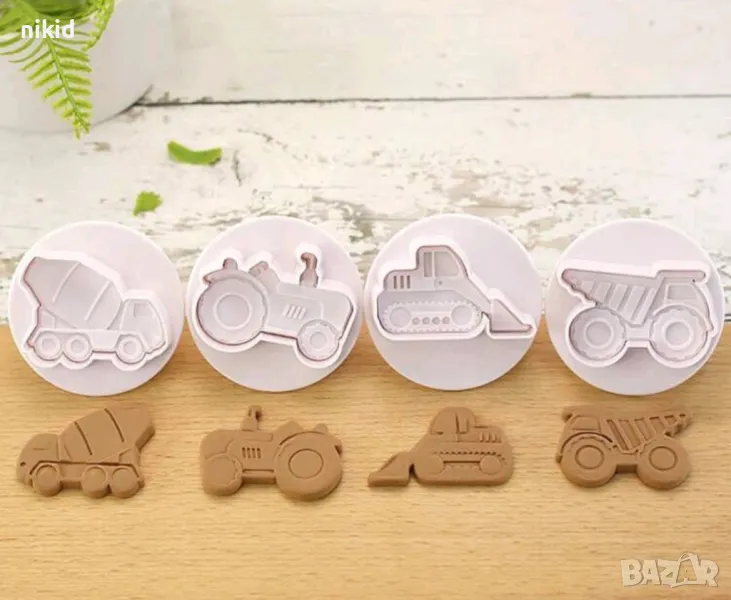 Багер Самосвал Трактор Булдозер 4 бр превозни форми с бутало резци за тесто фондан бисквитки сладки → Обява 18769491