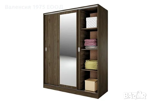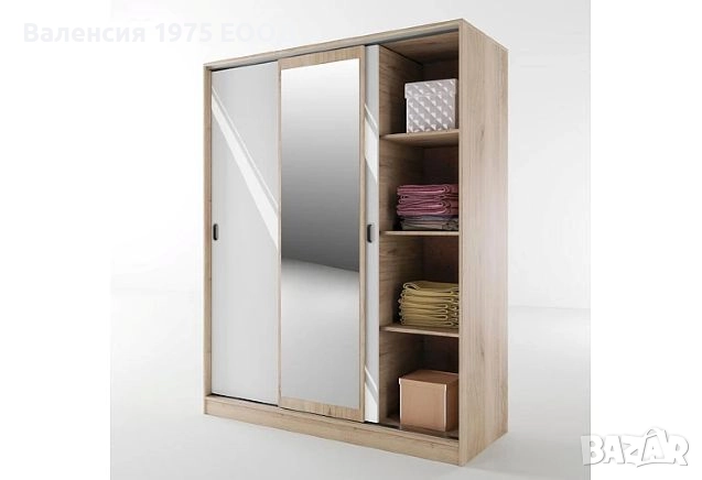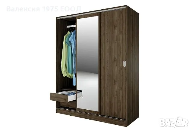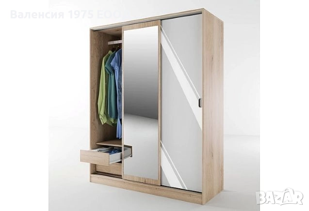 Гардероб с плъзгащи врати, огледало, две вътрешни чекмеджета, четири рафта и лост за закачалки