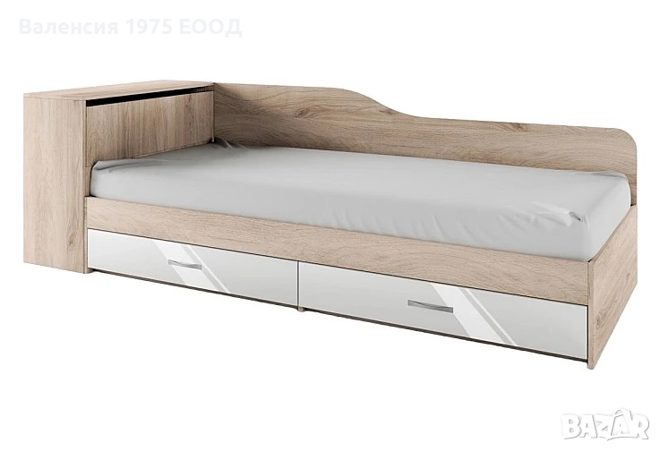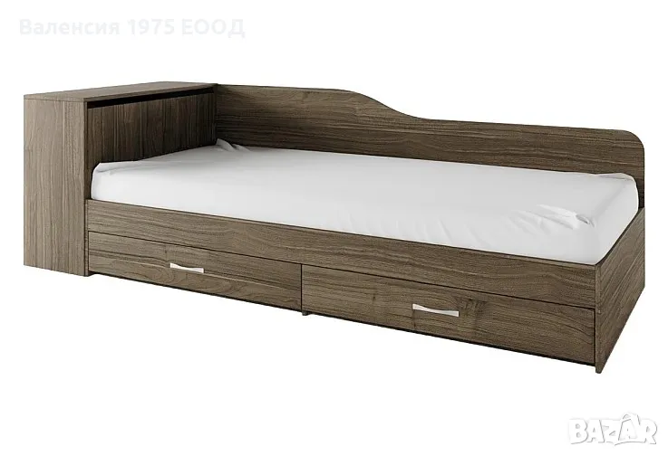 Легло с две чекмеджета за матрак 82/ 190 см, окомплектовано с ракла и странична извита табла. Раклата е самостоятелен модул и позволява монтаж за ляв или десен ъгъл.