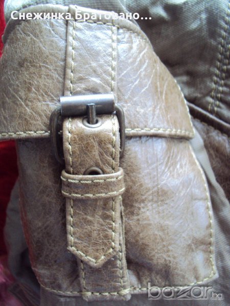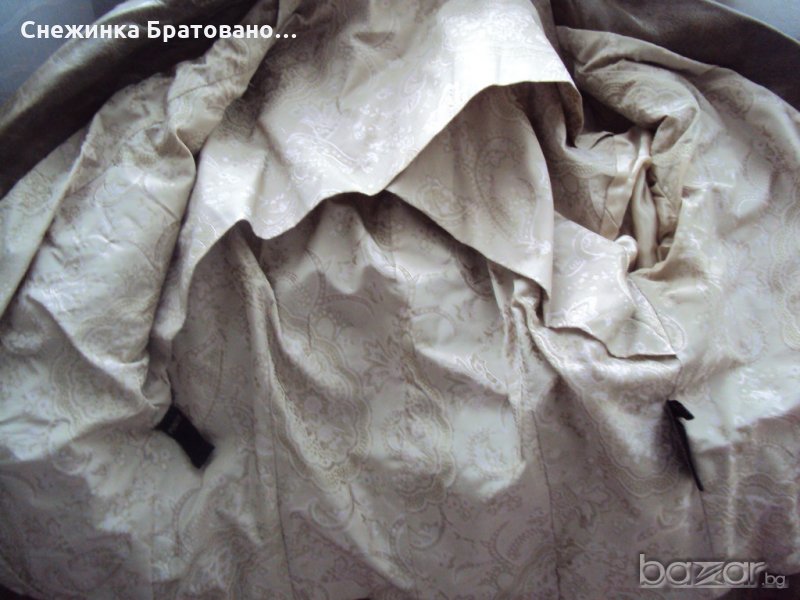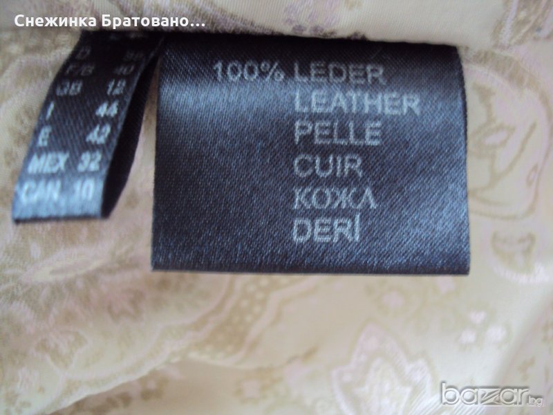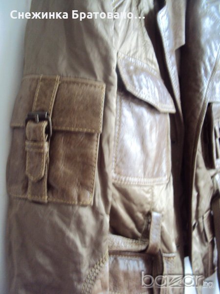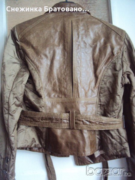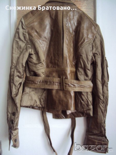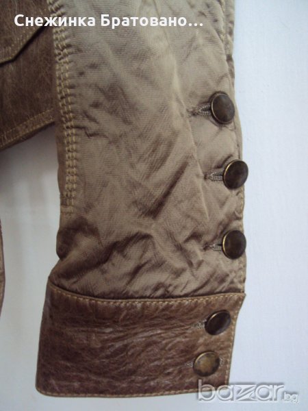 Дамско, марково сако на ПУНТО. Комбинация от естествена кожа и сатен, който има мачкан, лъскав външен вид. Перфектно състояние. Обличано до 5 пъти. Няма абсолютно никакви забележки, защото наистина не е носено, ръст 38. Оригинално. С подплата, която на гърба е ушита по специфичен начин, тоест дава ширина и удобство на гърба в движение, за да не опъва самата подплата. На ръкавите също има подплата от коприна. И много интересен завършек от копчета. Цената не се коментира.