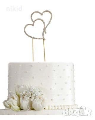 Метални двойни сърца сърце с диамантени камъни топер за забождане на торта сладкиш мъфин украса → Обява 18878591