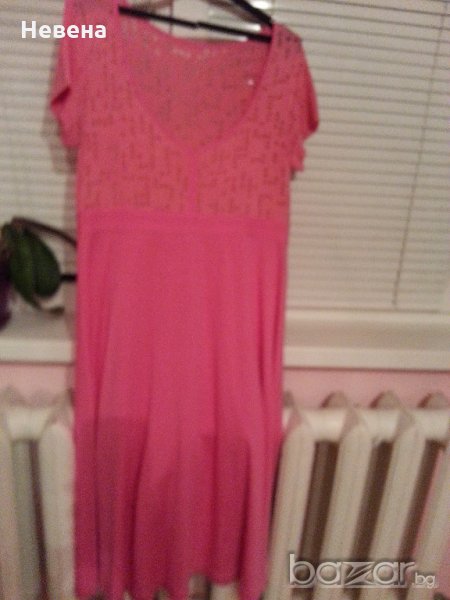 Лятна рокля от фин трикотажен плат, еластичен, много хубав розов цвят, разкроена от под бюста и се разширява надолу, горната част е полупрозрачна на фигурки. Размер около № 42-44-до 46 български размер /зависи от фигурата/. Материята е еластична. Бюст 42-44 см /или обиколка 84-88 см/, под бюста се разширява, дължина 103-104 см. Отговарям на съобщение тук, изпращам с куриер с отстъпка, преглед и тест, или лично получаване в София.