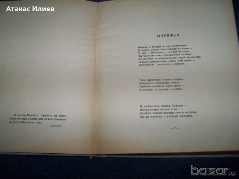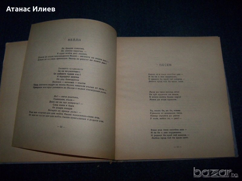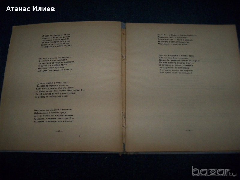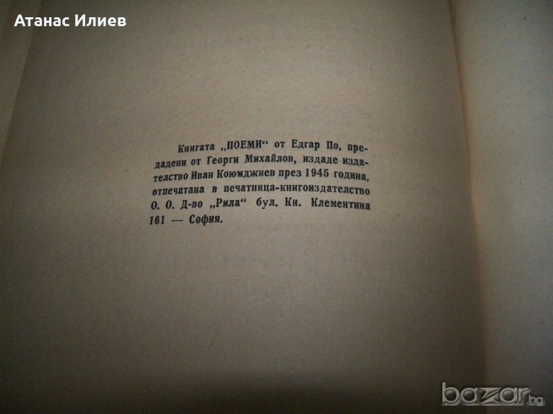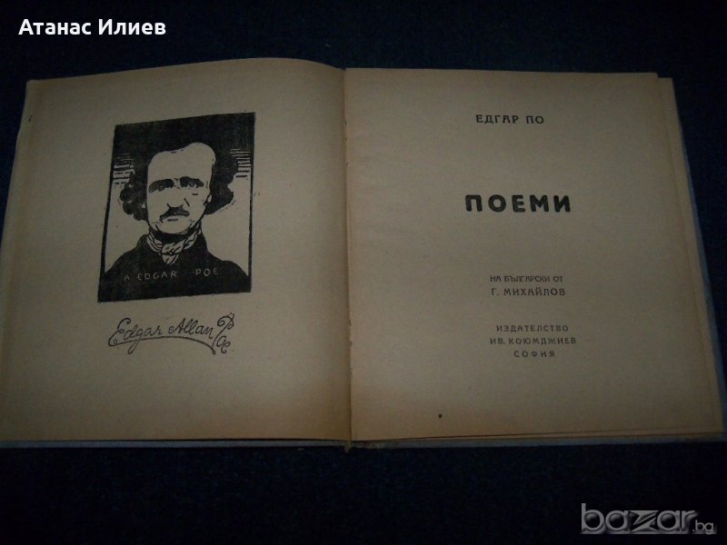 "Поеми" от Алън Едгар По. Книгата е издадена през 1945г. от издателство Иван Коюмджиев. Книгата е с твърди корици, 40 стр., няма липсващи страници, със зацапвания по кориците.