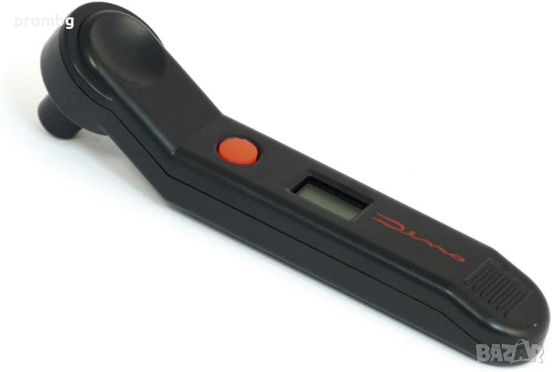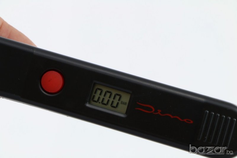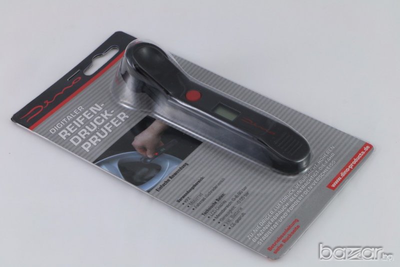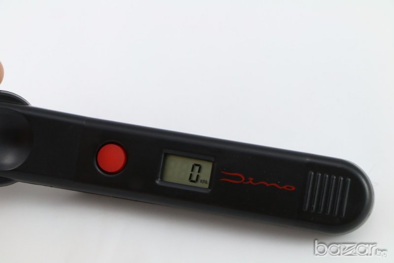 цифров манометър за гуми, Германия. Ефективен обхват 0-6.9 бара /точност прибл.0.05 бара/. Подходящ за коли, мотоциклети, велосипеди. Работи с батерии 2 х AG13 /LR44/. Превключвател за включване / изключване и избор на меню: бар, psi или kPa. Тегло 65 гр.