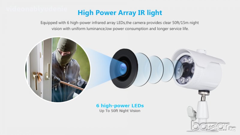 1 мегапиксел HD AHD 720p AHD охранителна видео камера от 4-то поколение с InfraRed подсветка от 6 H.LED Array лампи от 5-то поколение (Тайванска военна технология), осигуряващи кристална картина и голямо работно разстояние през нощта. AHD (Analog High Definition - най-високо качество) е нова технология с усъвършенствана CVBS (COMET*) & HD Видео трансмисия, позволяваща пренос на видеосигнал с мегапикселова резолюция (720p) по коаксиален кабел на разстояние до 700 метра (RG6). Този вид системи не изискват изграждането и конфигурирането на мрежа, използват традиционната схема на свързване с коаксиален кабел и BNC конектори между камерата и видеорекордера, което прави възможно използването на съществуващи коаксиални трасета. Поради липса на компресиране на сигнала в камерата, технологията позволява наблюдение с мегапикселова резолюция, без закъснение/накъсване и без сложно конфигуриране. Липсата на допълнителни мрежови устройства - сървъри и софтуер, прави AHD системата оптималното решение за мегапикселово видеонаблюдение – икономично, лесно за инсталация, надеждно и опростено.