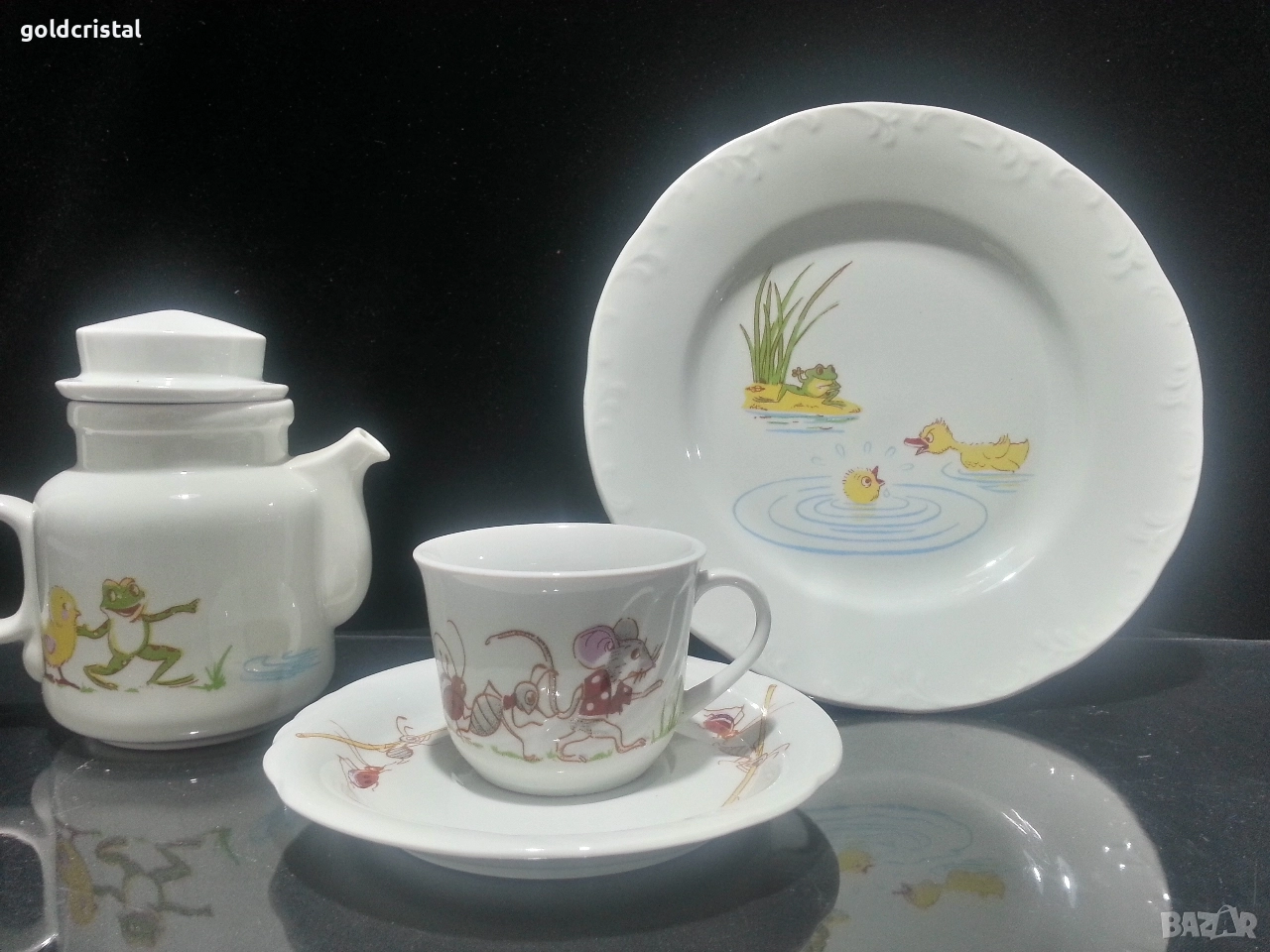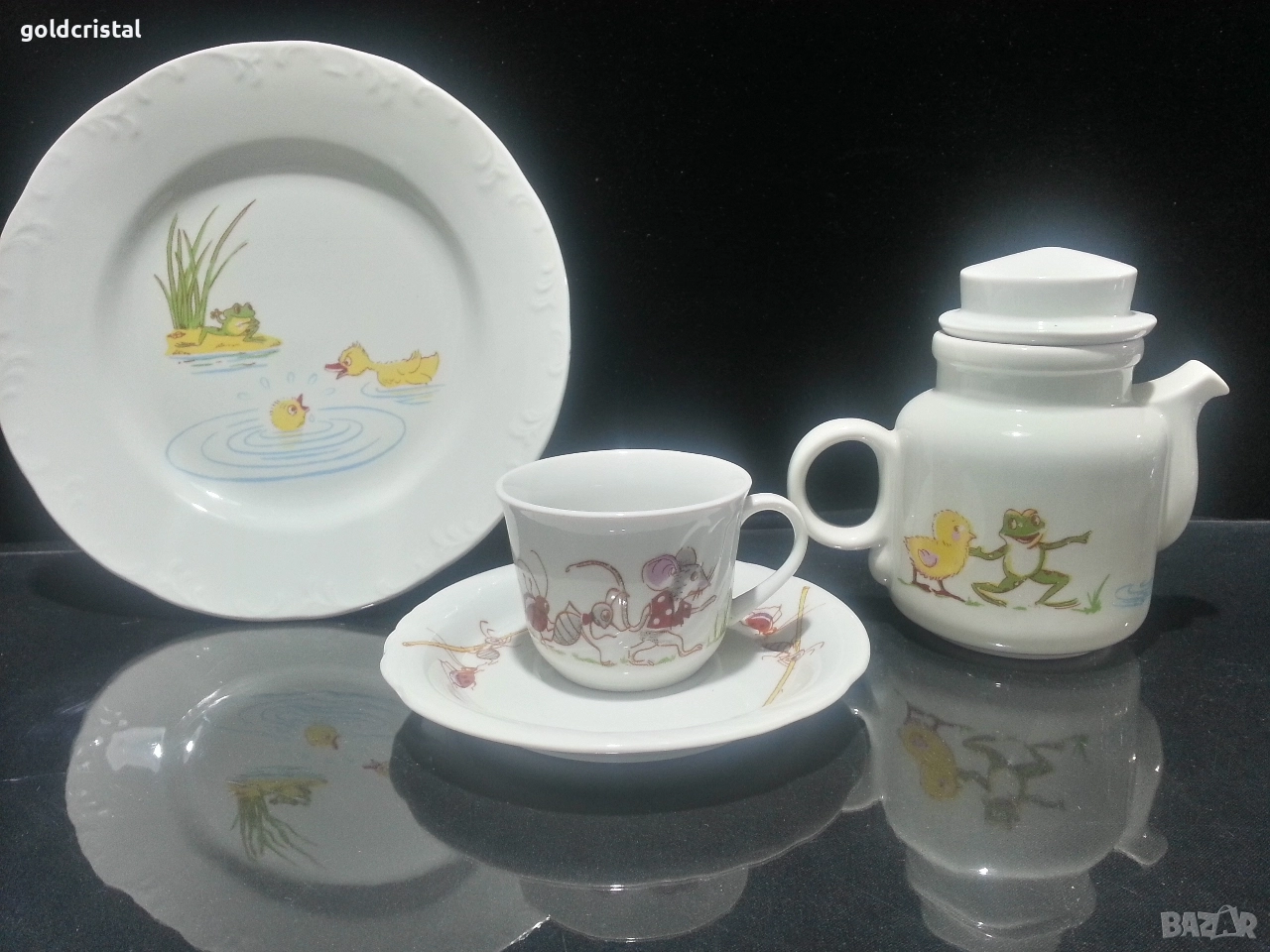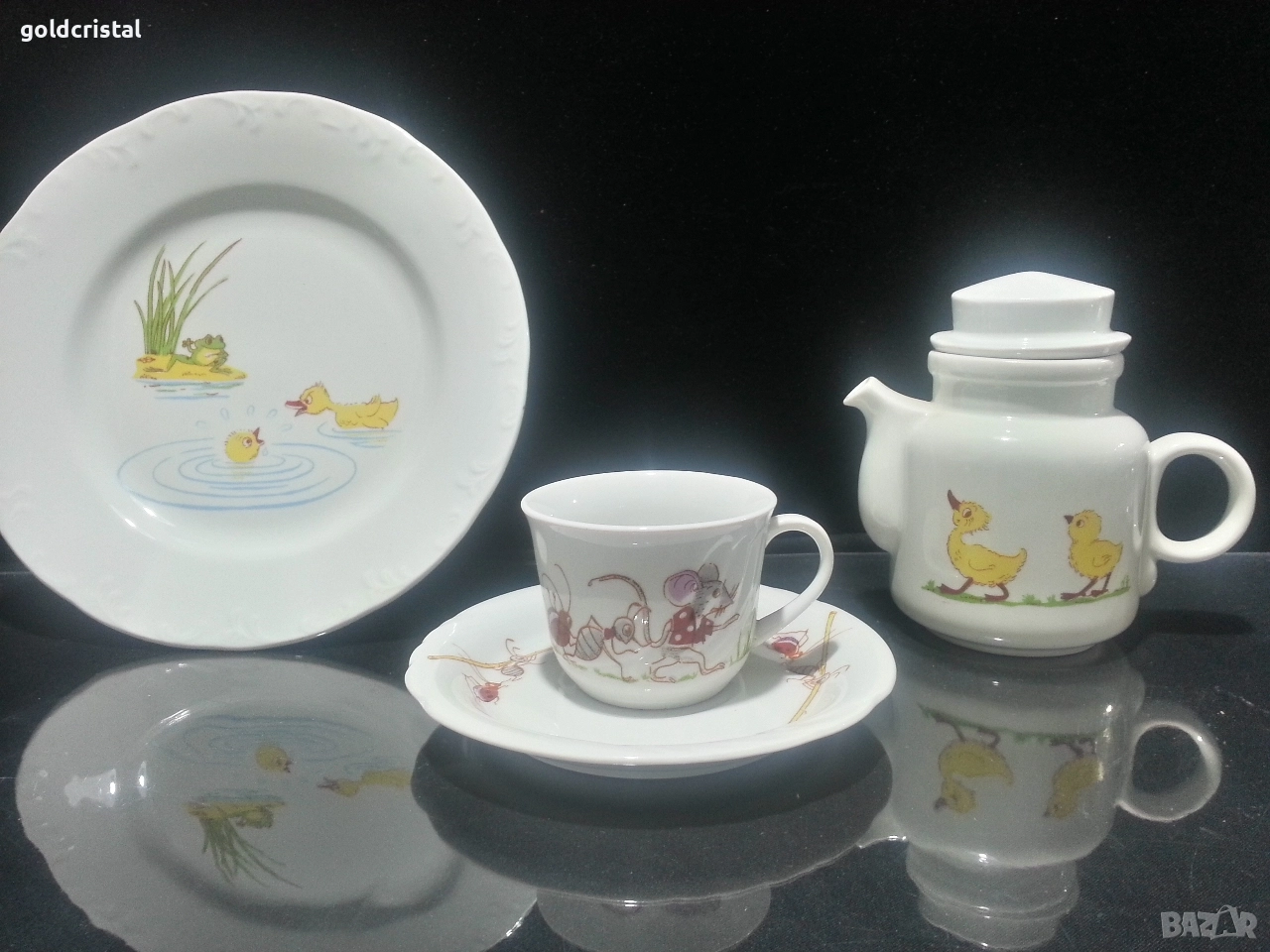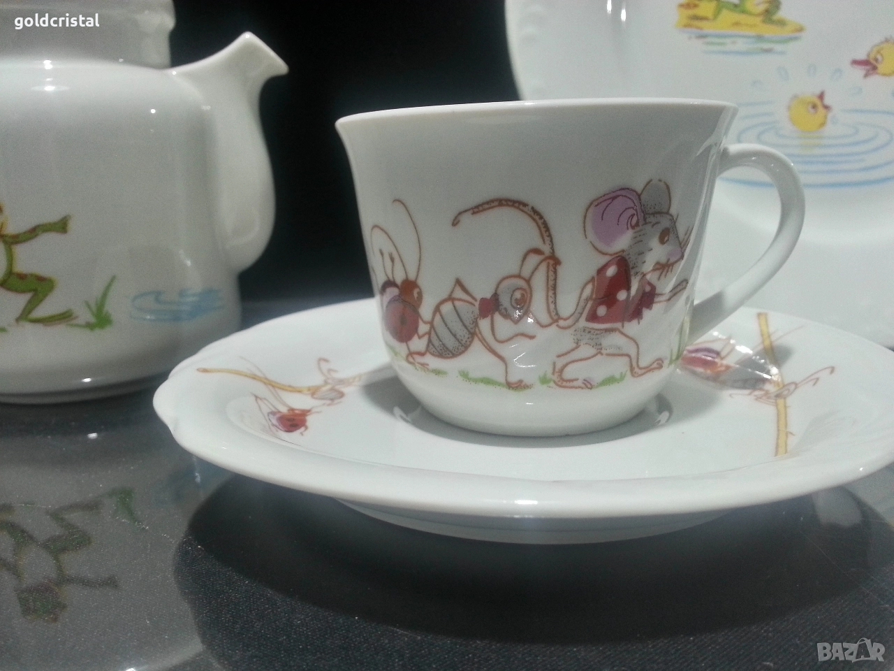 Стар български порцелан детски комплект чиния плитка чаша с чинийка и каничка сервиз комплект сет лот ретро арт декор винтидж колекция стари старинни антикварни предмети обзавеждане за дома и семейството подходящи за подарък за ценители и колекционери