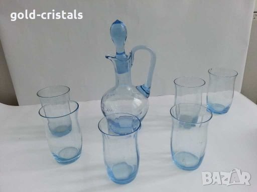 Стъклена каничка гарафа с тапа и 6бр чаши цветно синьо стъкло антикварен стар ретро арт декор винтидж колекция сервиз комплект сет лот стари антикварни предмети обзавеждане за дома и семейството подходящи за подарък за ценители и колекционери