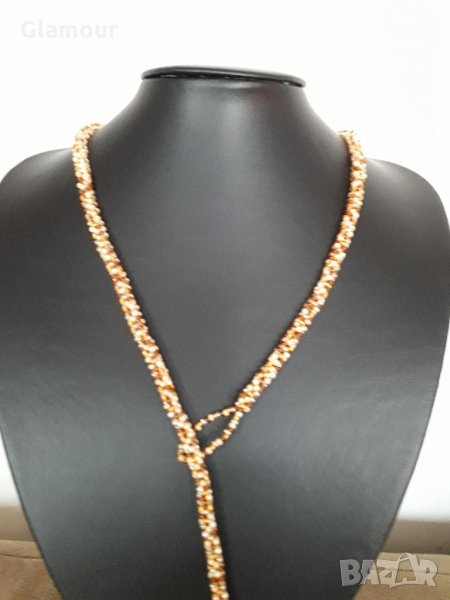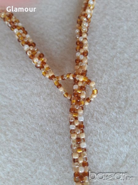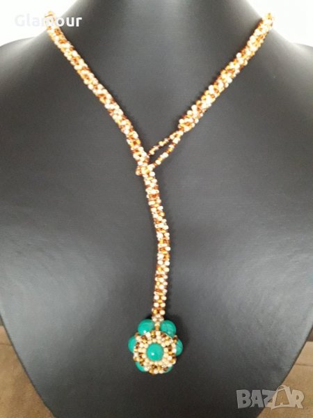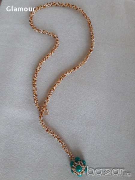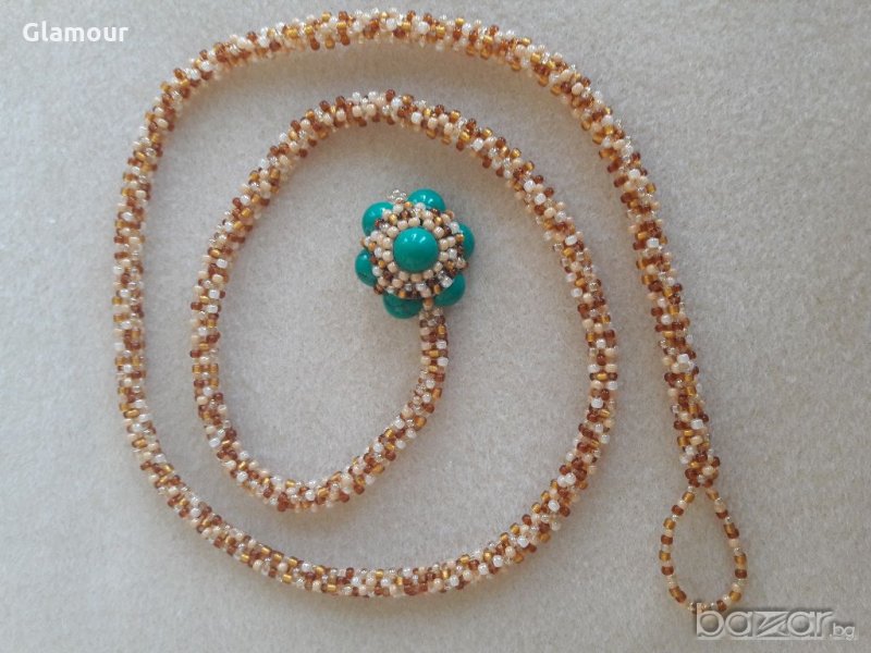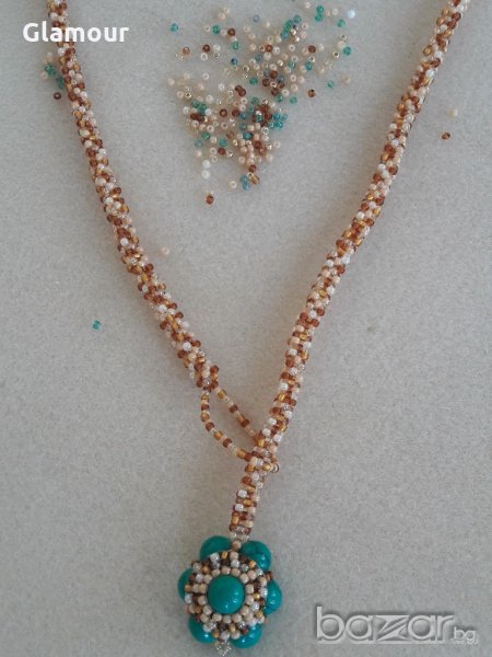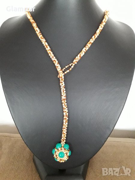 Колието е ръчно изработено от зелен хаулит и мъниста тохо,дължината му от край до край е 65 см., диаметъра на висулката е 2.5см.Може да се носи и по врата, със свободно пусната висулка в края.