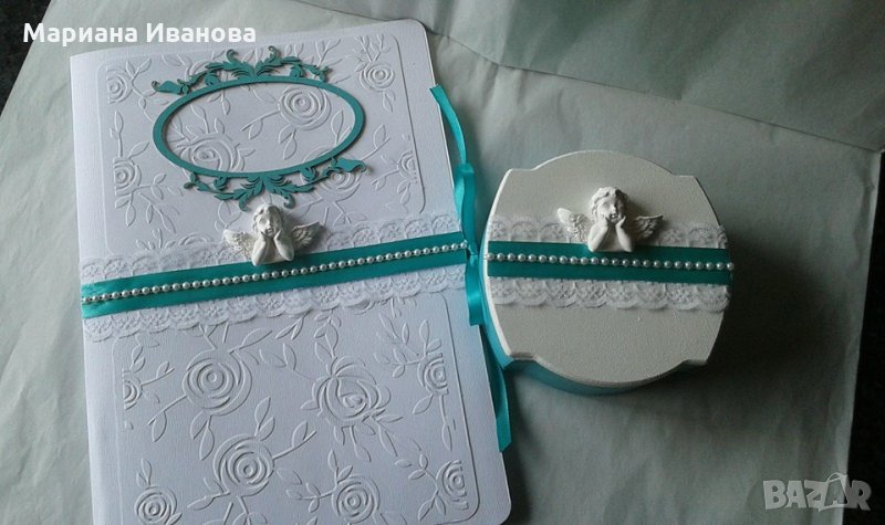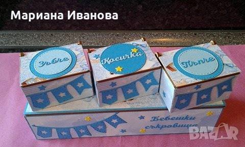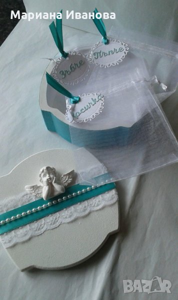 предлагам още: торбичка от органза с украса за сапунчето - 9.00; кутия за бебешки съкровища, дървена, голяма-30 лв; подаръчета 1.80-2.80 лв.; кутия за дрехи/голяма/- 40.00 лв. Може да се изберат част от артикулите