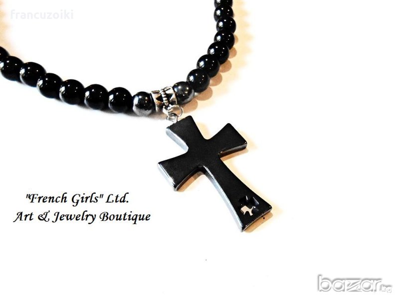 Мъжко колие от полускъпоценни камъни - черен оникс и хематит. Колието е нанизано върху здрава основа и е декорирано с кръст от хематит. Дължина на колието: 65 см