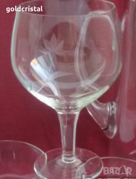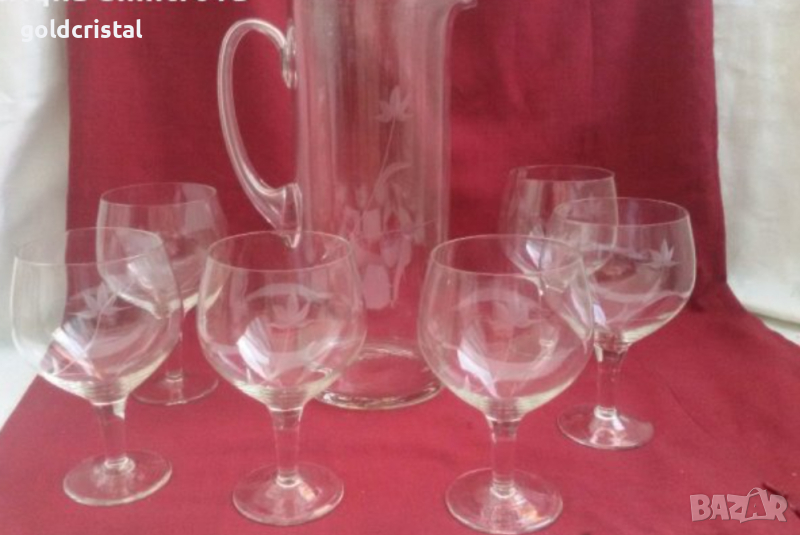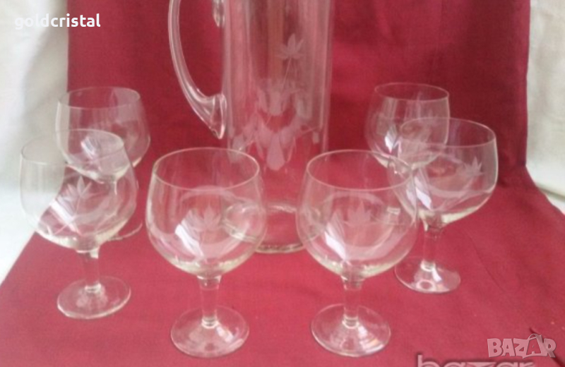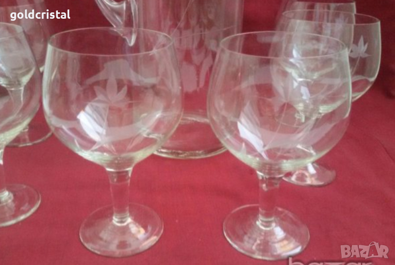 ретро стъклени чаши иголяма кана и 6бр стъклени чаши на столче ръчно гравирани каната и чашите сервиза никога не е ползван сервиз комплект сет лот ретро без забележки ретро арт с декор винтидж колекция стари старинни антикварни предмети обзавеждане за дома и семейството подходящи за подарък за ценители и колекционери