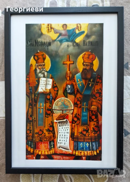 Продавам икона Св. Св. Кирил и Методий, с черна рамка и стъкло. Размер на рамката 33 см на 23.5 см., можe да се окачва на стена.